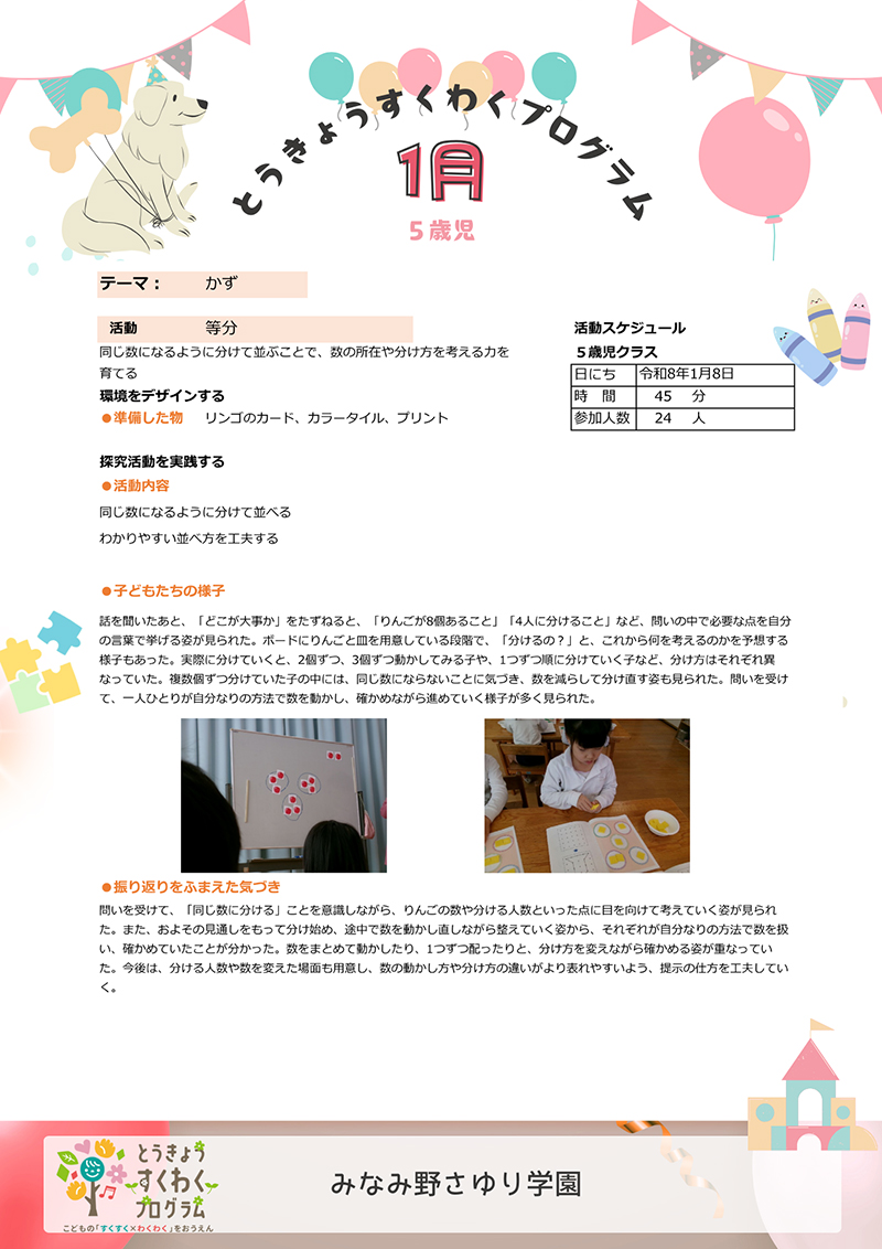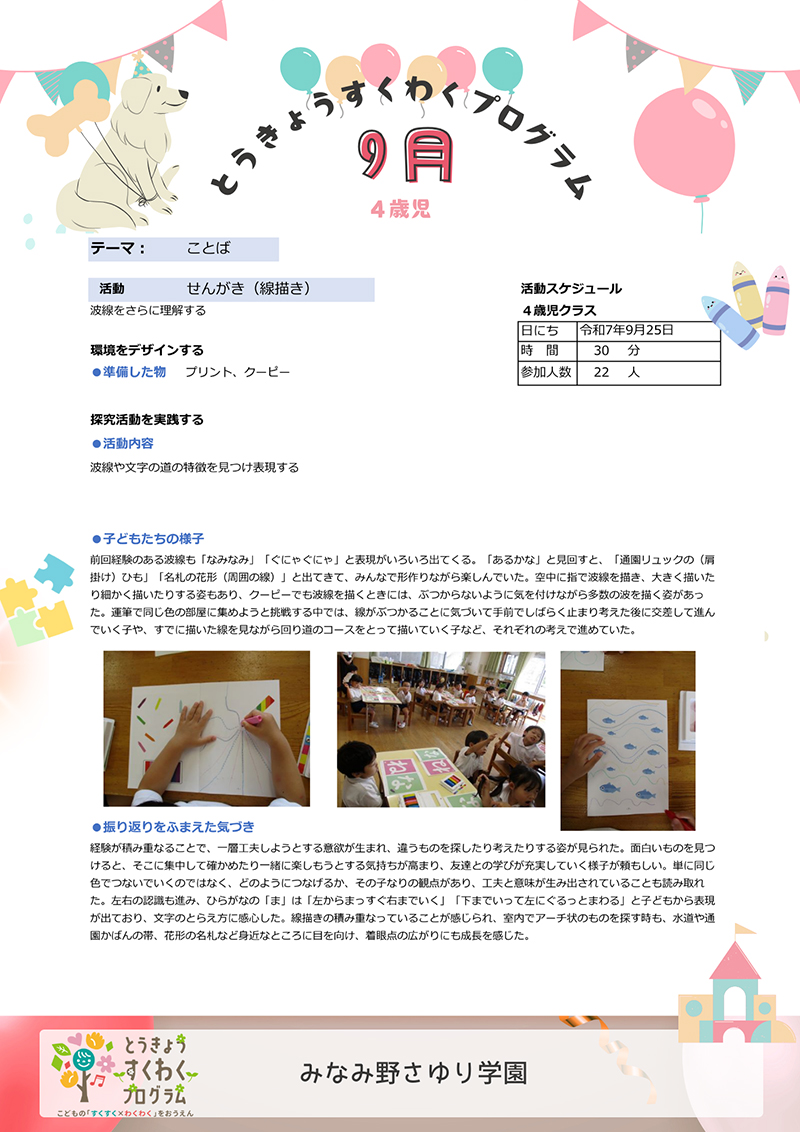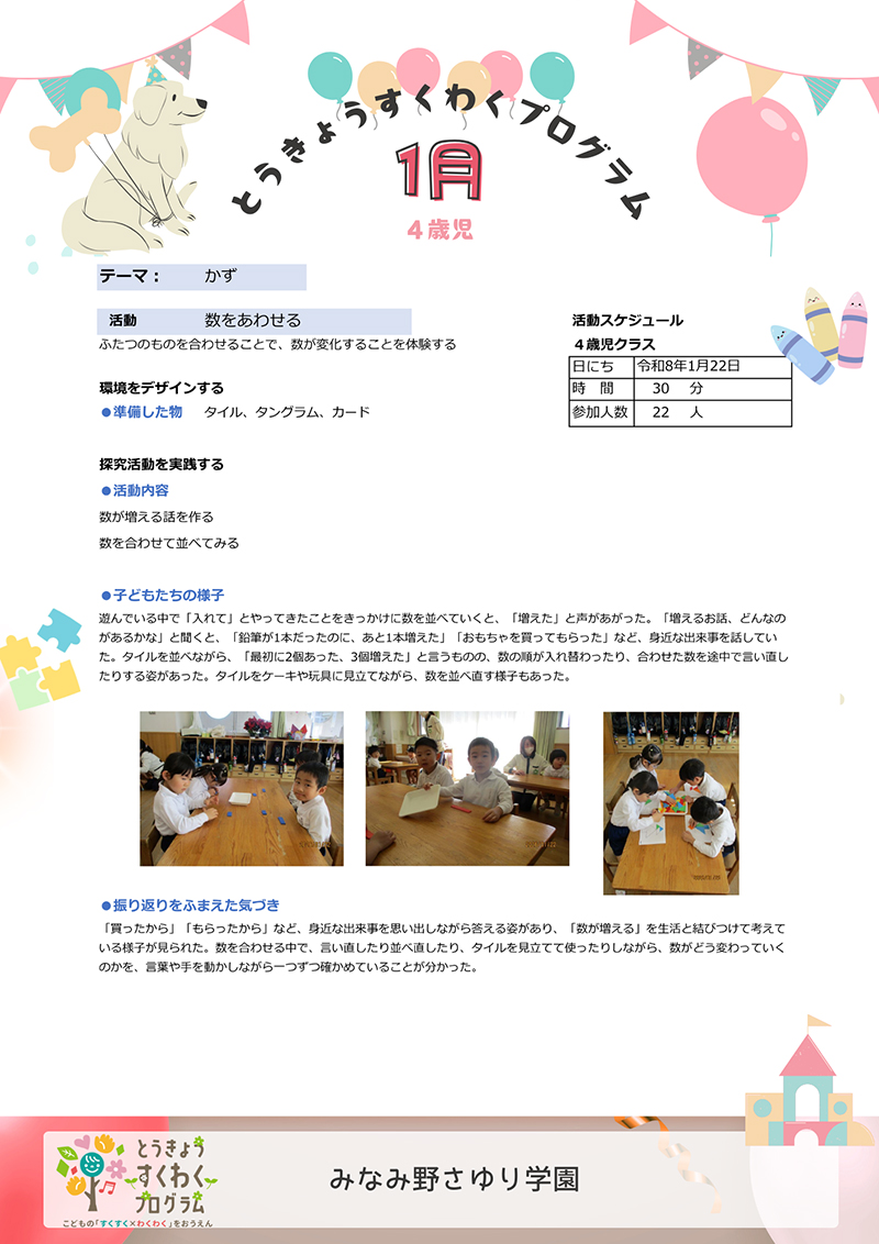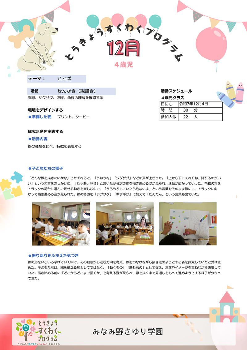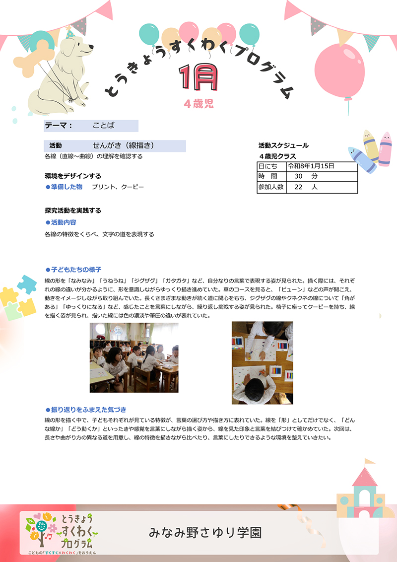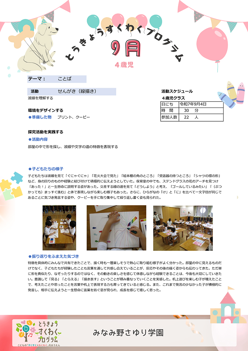 みなみ野さゆり学園では「やわらかな教育・保育をめざし、子どもが持つ可能性の引き出しを育む」という理念のもと、一人ひとりの子どもに寄り添いながら心の育ちをサポートする「すくわくプログラム」を実施しています。詳しくはこちらをご覧ください。