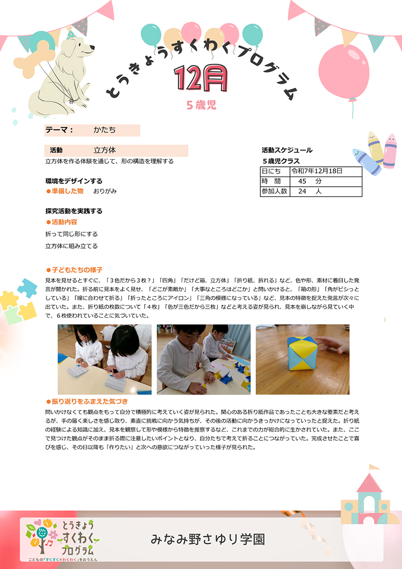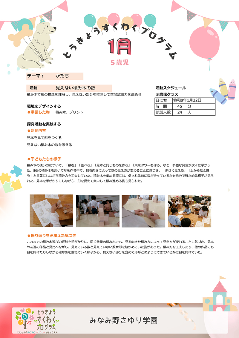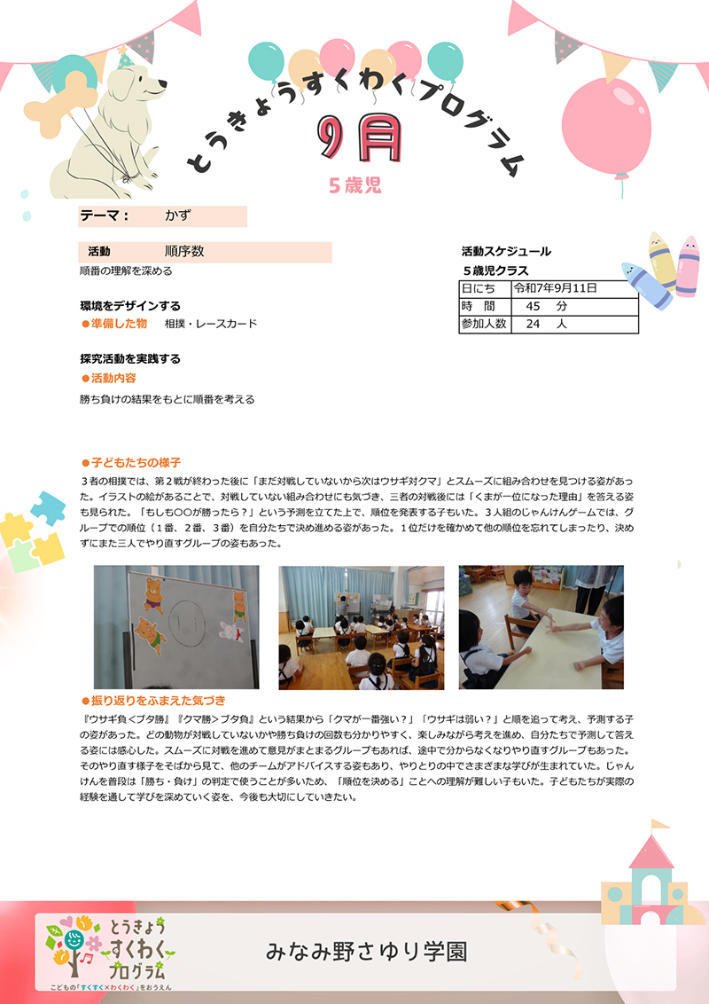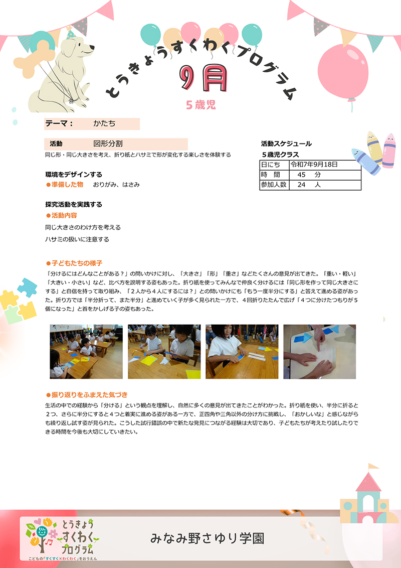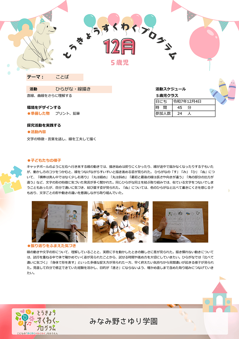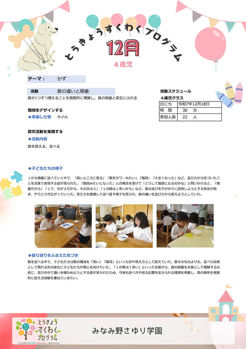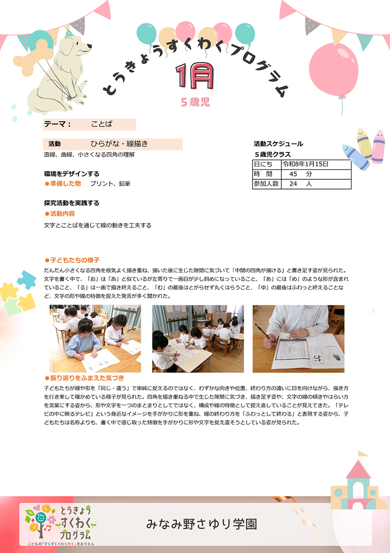 みなみ野さゆり学園では「やわらかな教育・保育をめざし、子どもが持つ可能性の引き出しを育む」という理念のもと、一人ひとりの子どもに寄り添いながら心の育ちをサポートする「すくわくプログラム」を実施しています。詳しくはこちらをご覧ください。