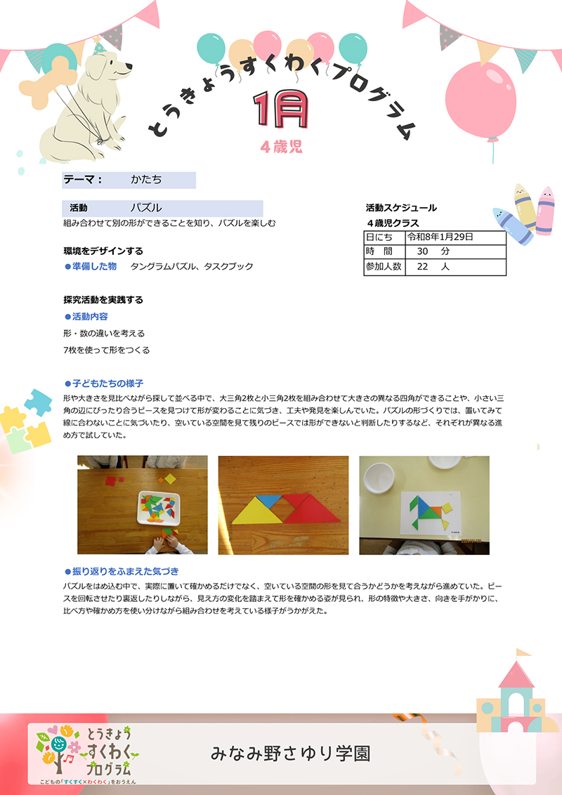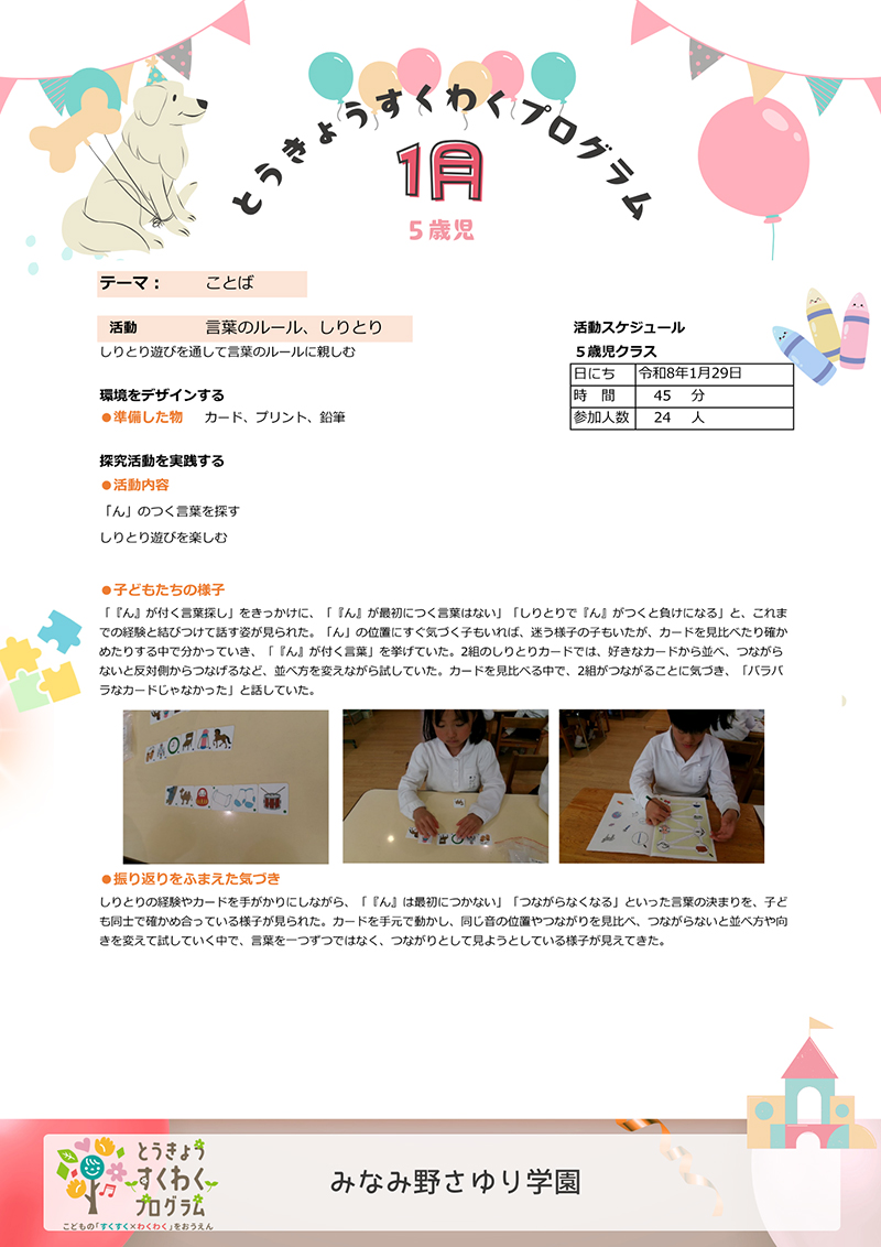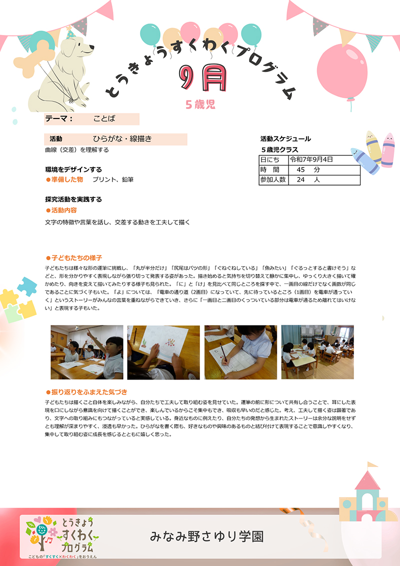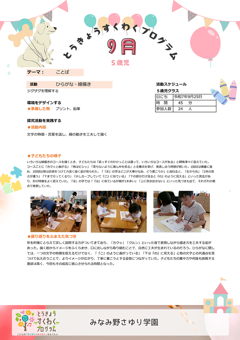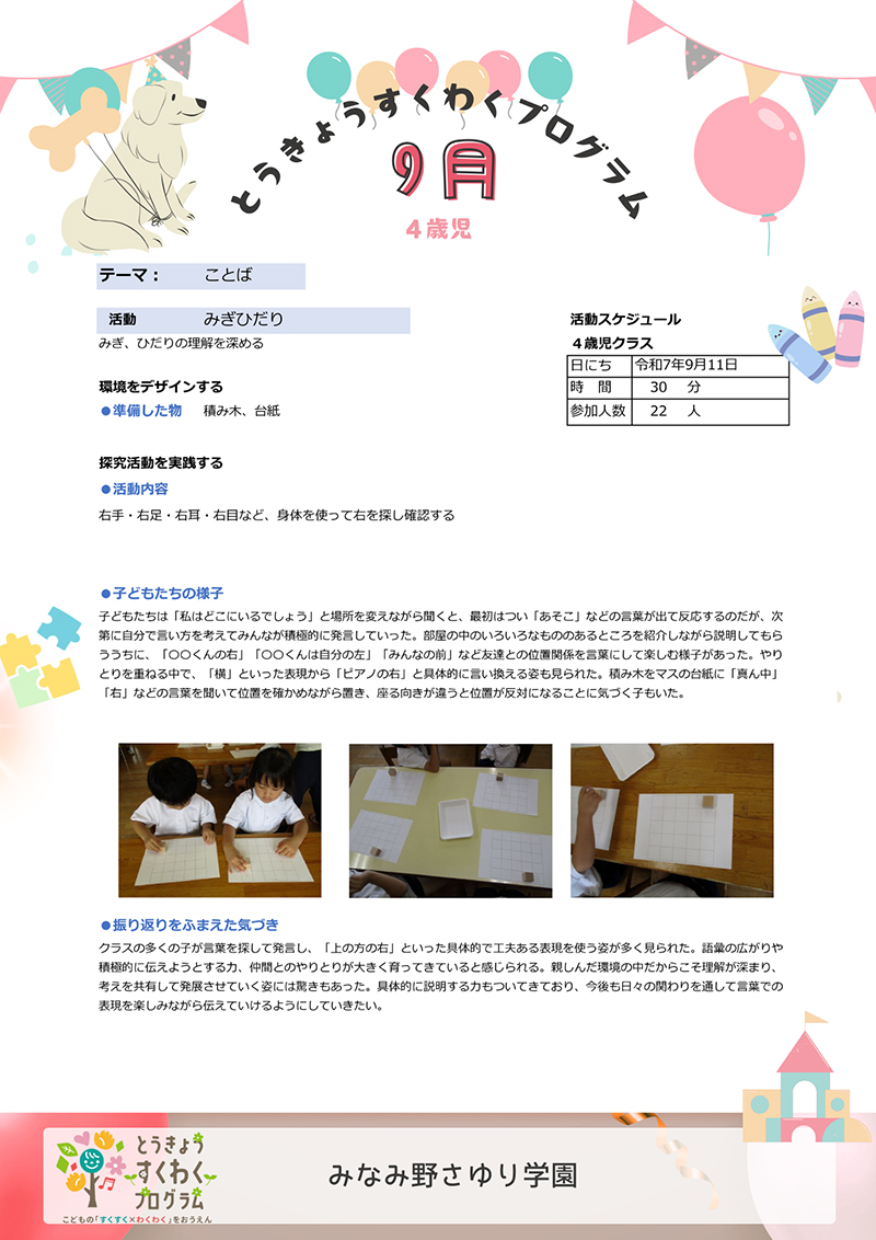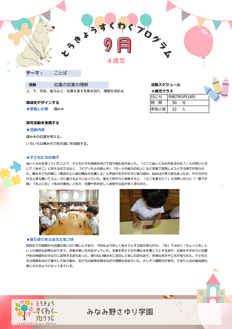 みなみ野さゆり学園では、毎月のカリキュラムの中に遊びの感覚で取り入れることのできる「チャイルドステップ」を導入しています。