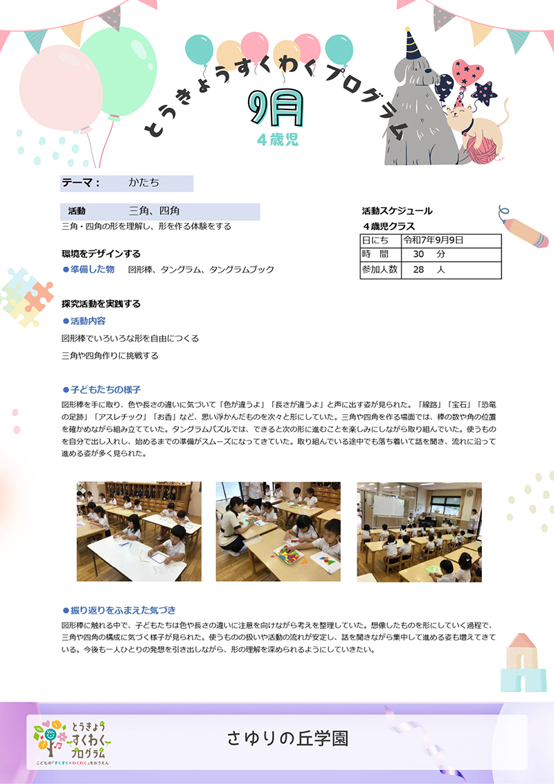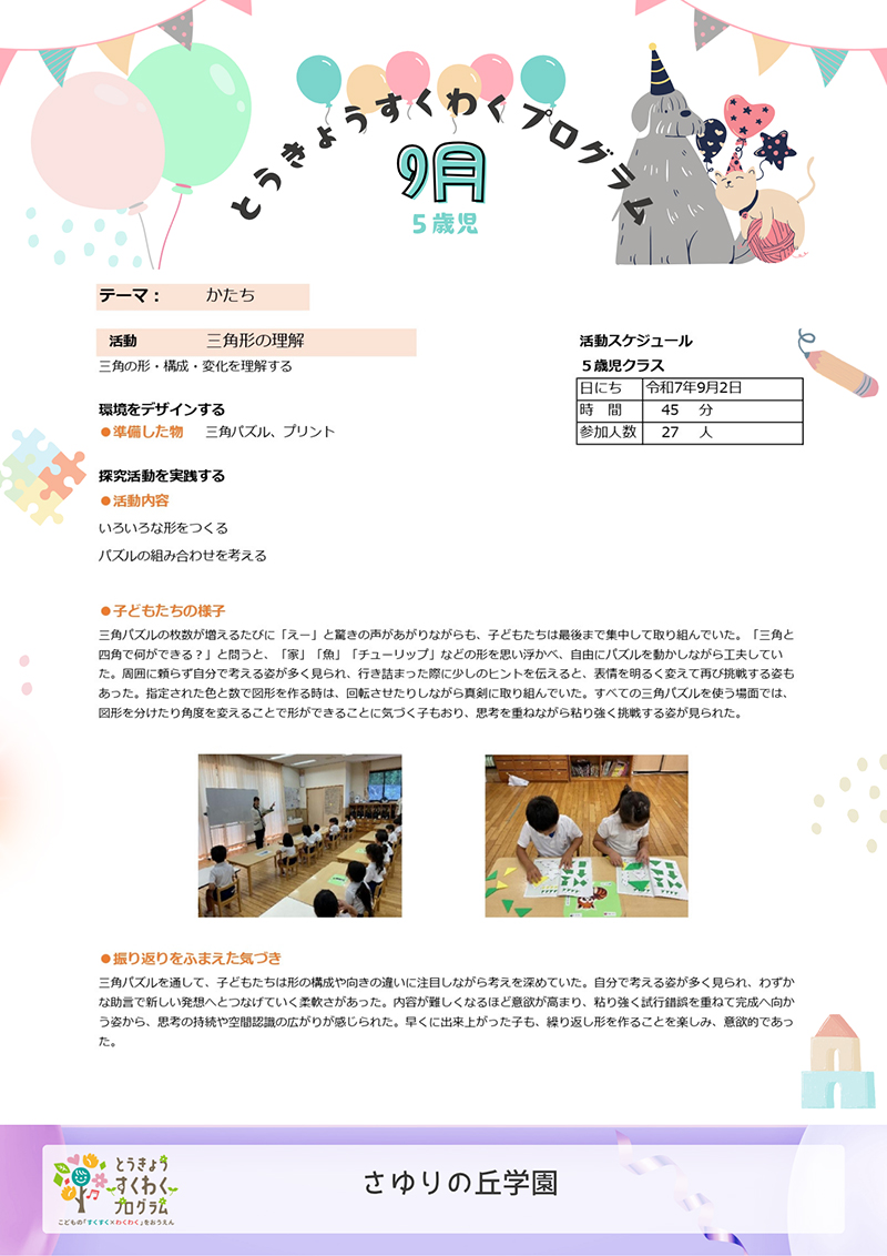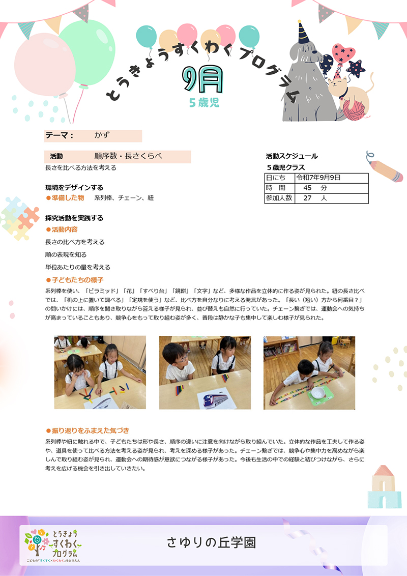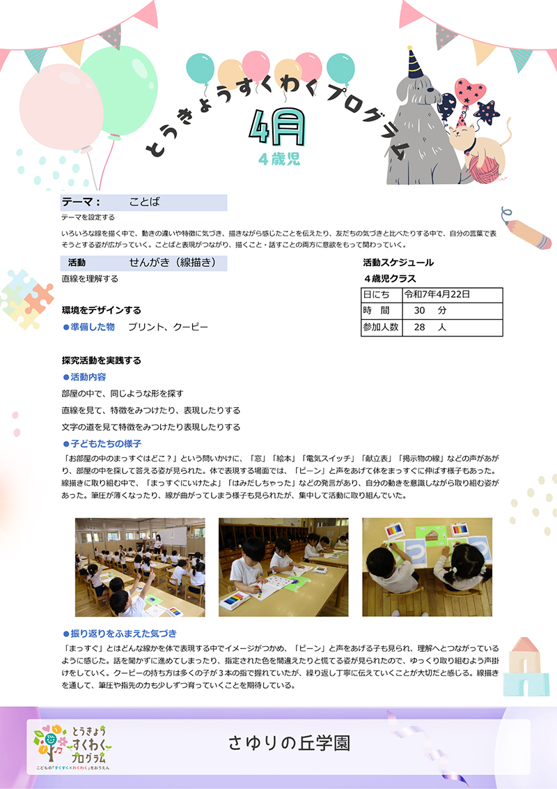 さゆりの丘学園では、4歳児クラスから毎月のカリキュラムの中に遊びの感覚で取り入れることのできる「チャイルドステップ」を導入しています。学園の保育理念と同様、遊びや生活の中にこそ、学びにつながるたくさんの題材があり、それら一つひとつを自分の力で論理的に物事を解決していくことが出来る能力を養うための活動を目的としています。