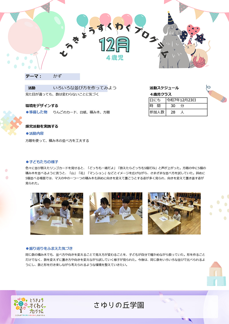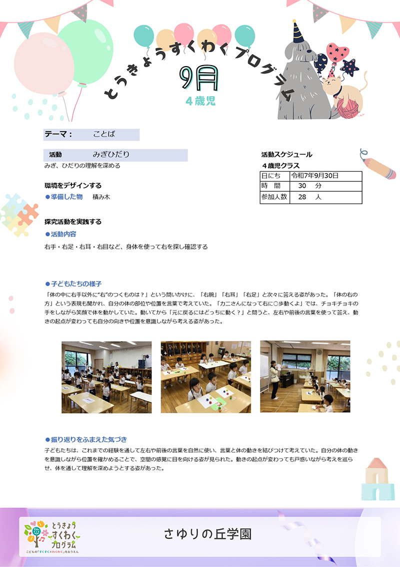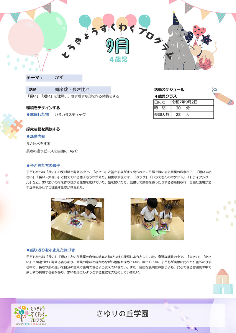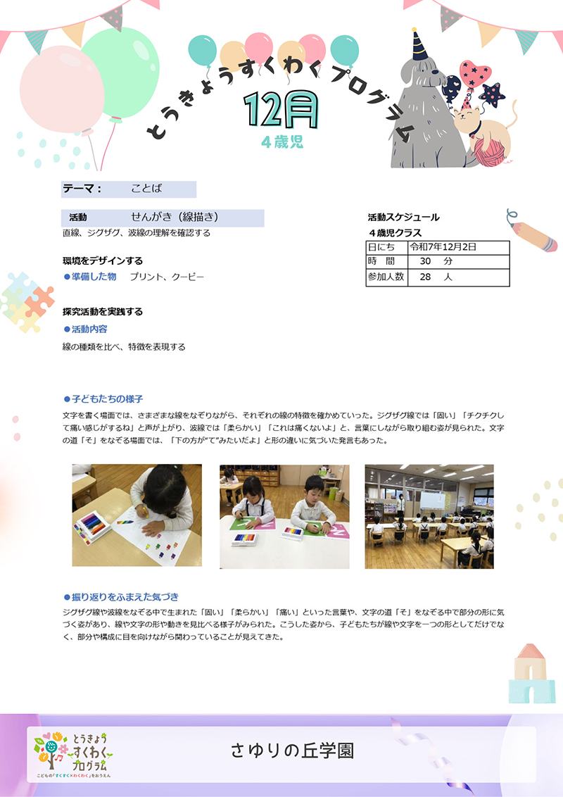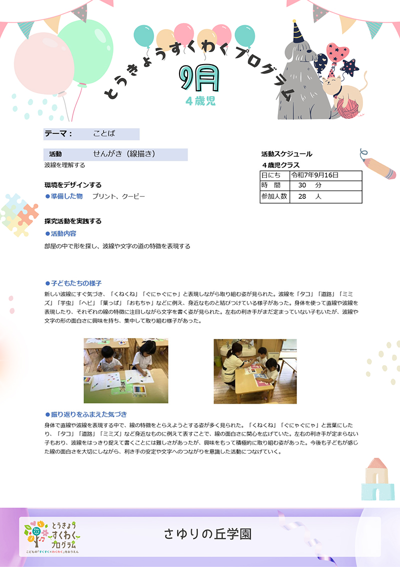 さゆりの丘学園では「やわらかな教育・保育をめざし、子どもが持つ可能性の引き出しを育む」という理念のもと、一人ひとりの子どもに寄り添いながら心の育ちをサポートする「すくわくプログラム」を実施しています。詳しくはこちらをご覧ください。
