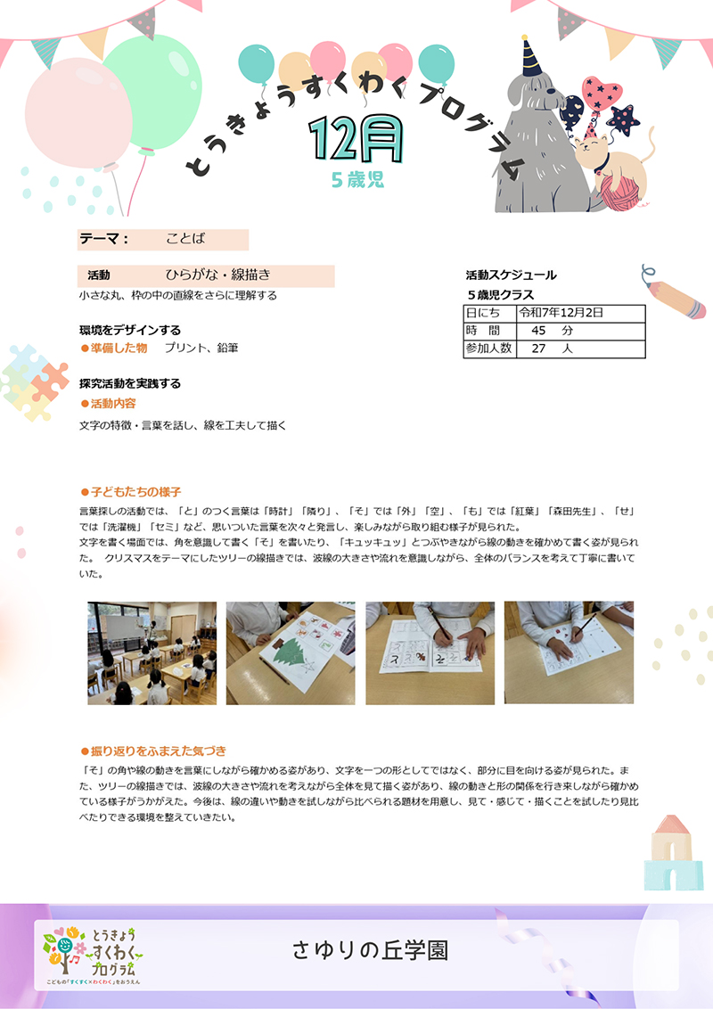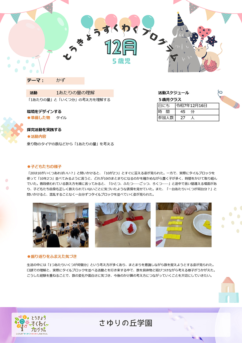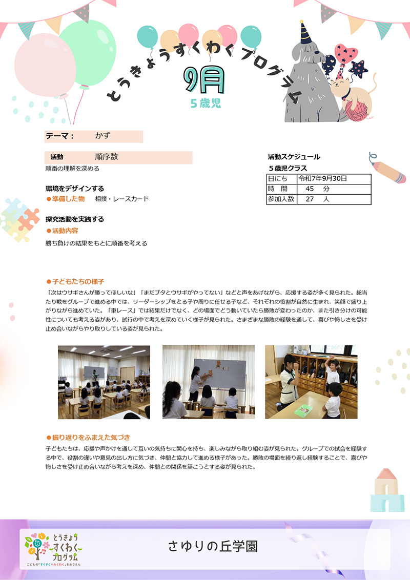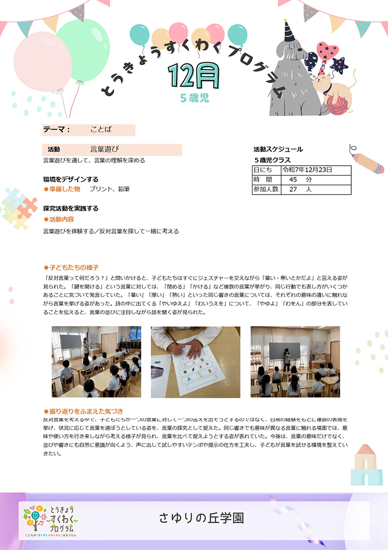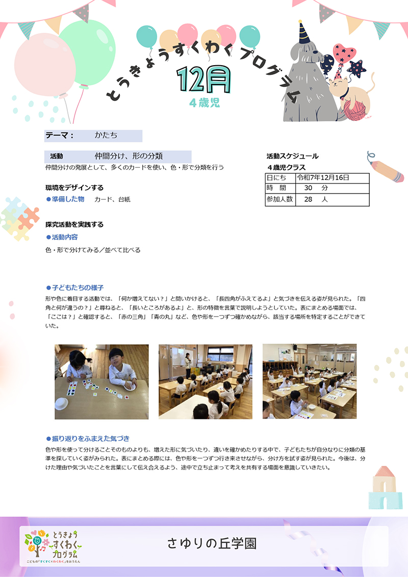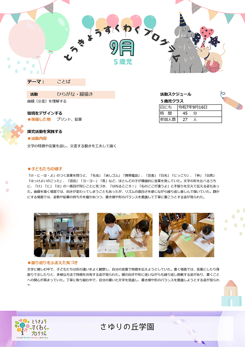 さゆりの丘学園では「やわらかな教育・保育をめざし、子どもが持つ可能性の引き出しを育む」という理念のもと、一人ひとりの子どもに寄り添いながら心の育ちをサポートする「すくわくプログラム」を実施しています。詳しくはこちらをご覧ください。