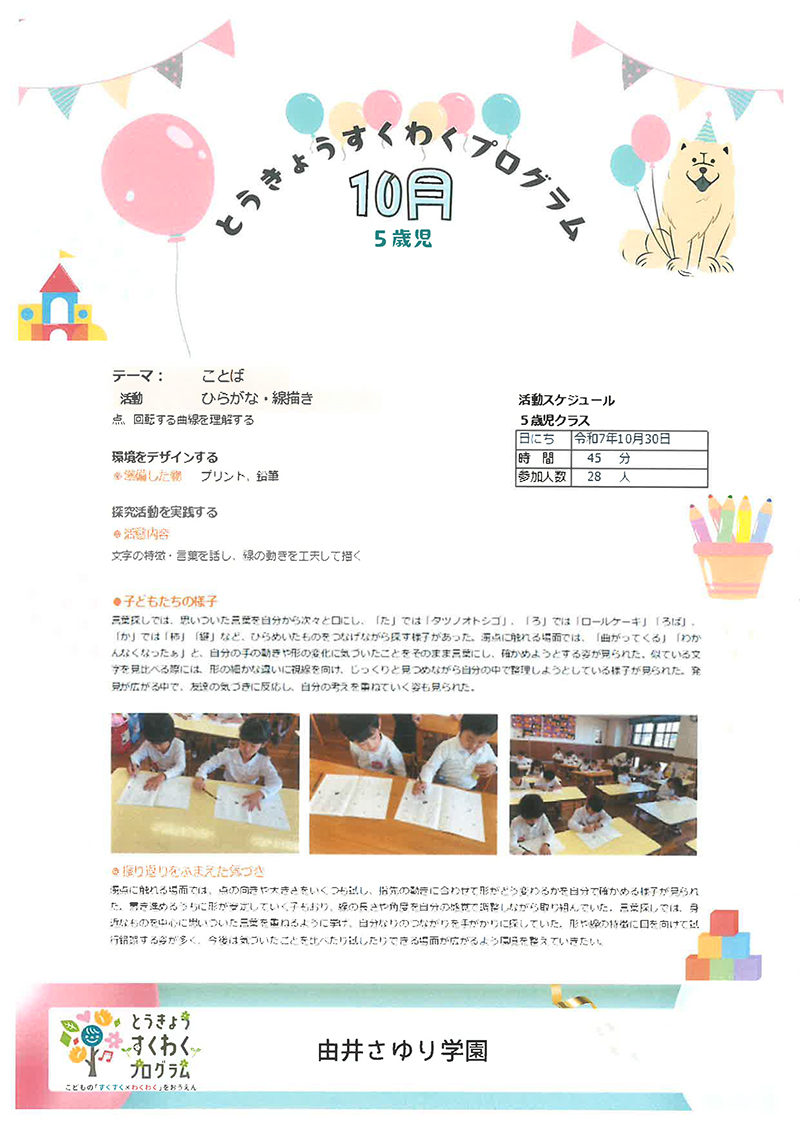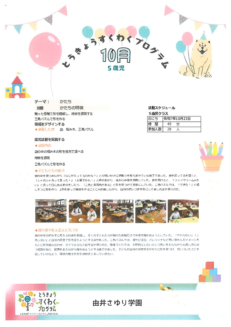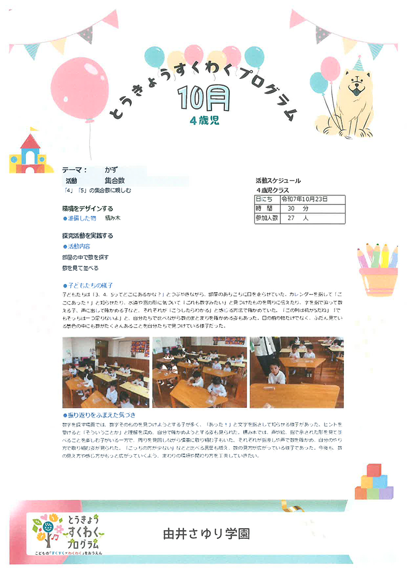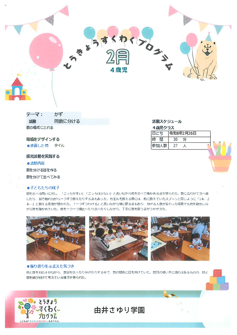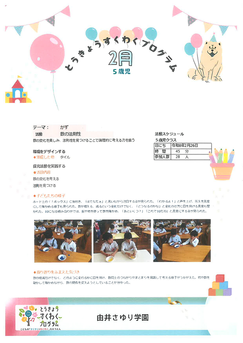 由井さゆり学園では「やわらかな教育・保育をめざし、子どもが持つ可能性の引き出しを育む」という理念のもと、一人ひとりの子どもに寄り添いながら心の育ちをサポートする「すくわくプログラム」を実施しています。詳しくはこちらをご覧ください。