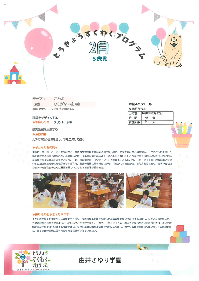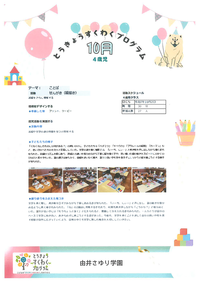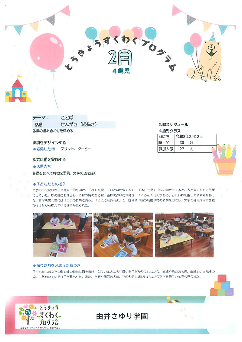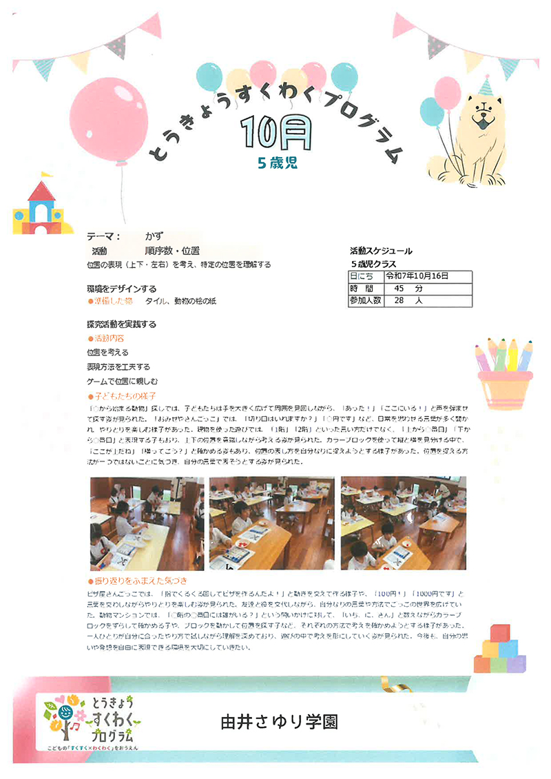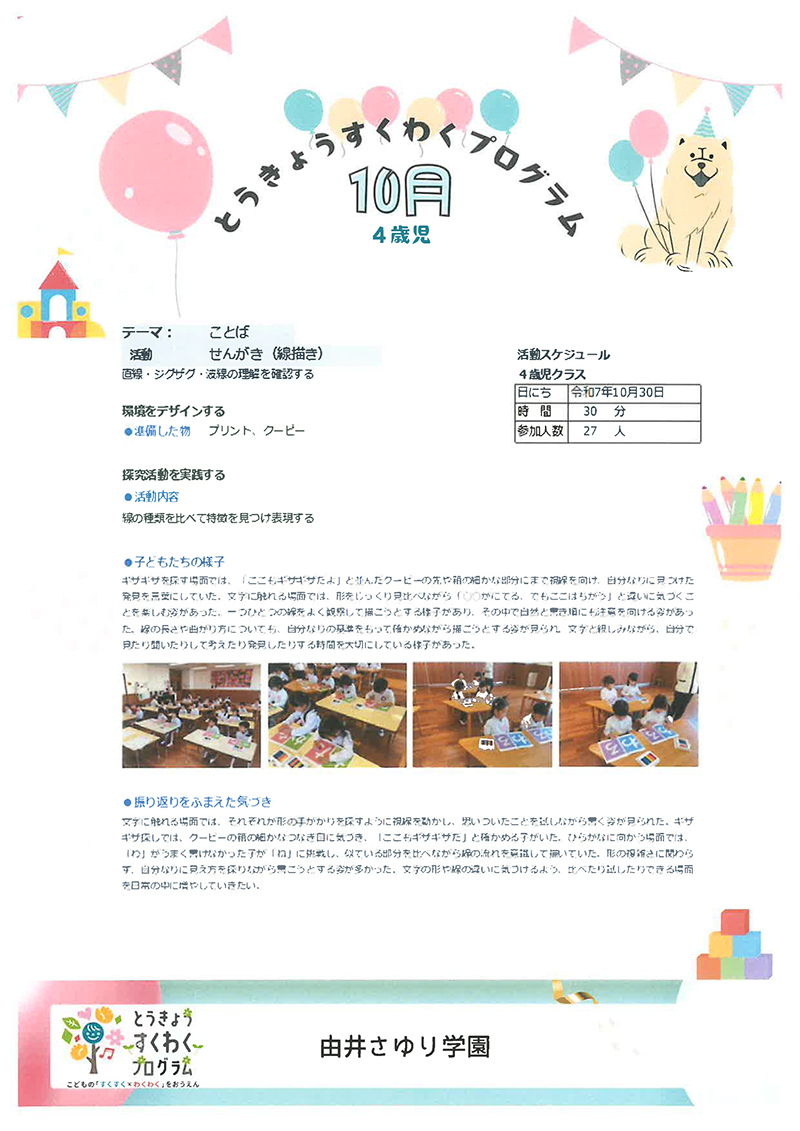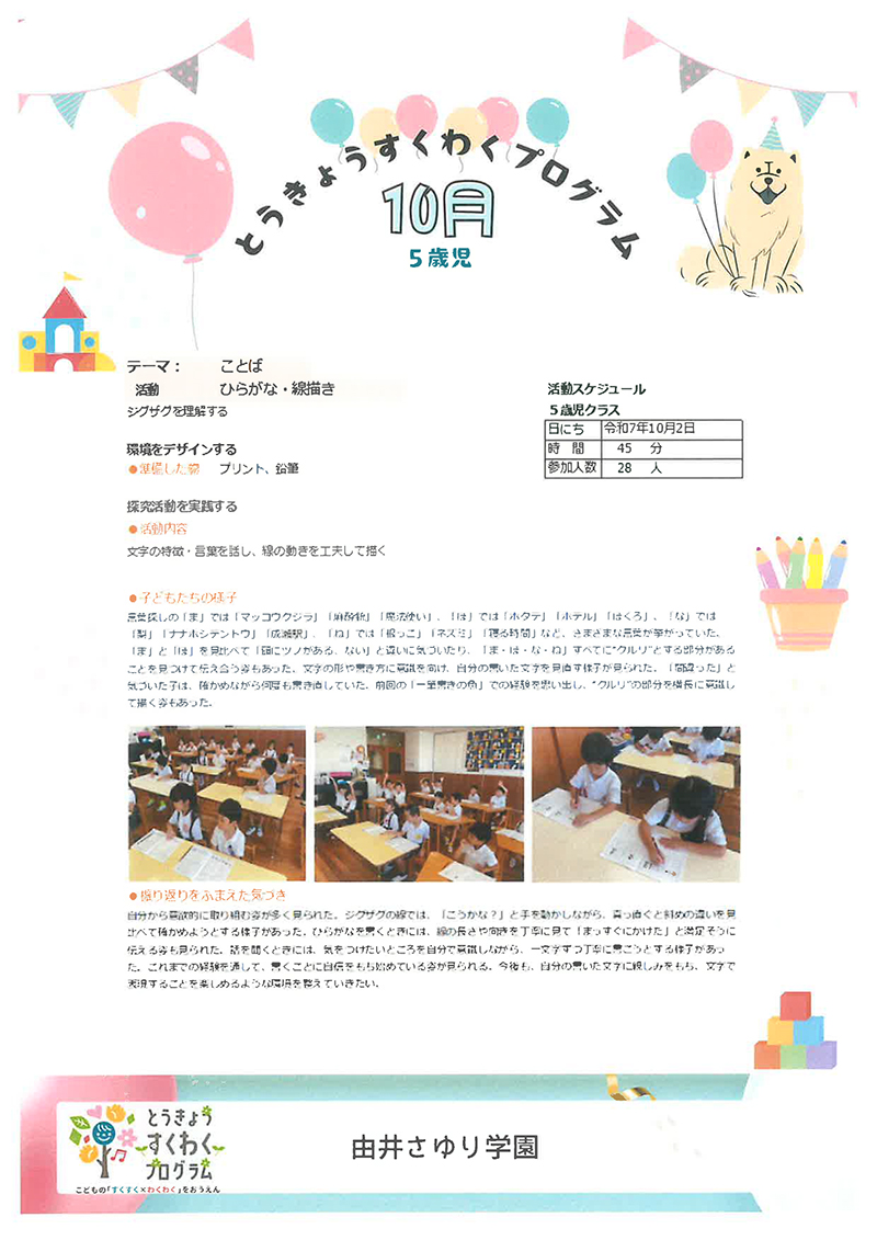 由井さゆり学園では「やわらかな教育・保育をめざし、子どもが持つ可能性の引き出しを育む」という理念のもと、一人ひとりの子どもに寄り添いながら心の育ちをサポートする「すくわくプログラム」を実施しています。詳しくはこちらをご覧ください。