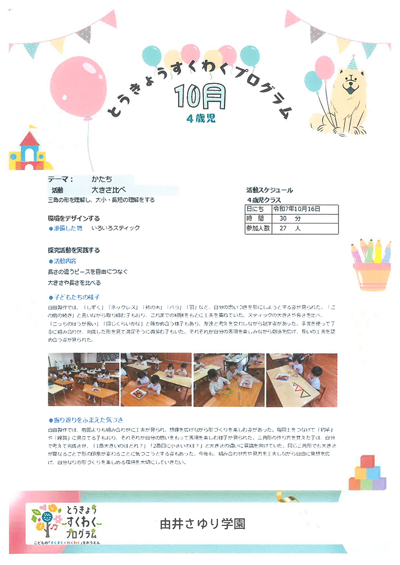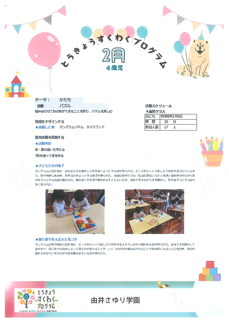 由井さゆり学園では、毎月のカリキュラムの中に遊びの感覚で取り入れることのできる「チャイルドステップ」を導入しています。 学園の保育理念と同様、遊びや生活の中にこそ、学びにつながるたくさんの題材があり、それら一つひとつを自分の力で論理的に物事を解決していくことが出来る能力を養うための活動を目的としています。